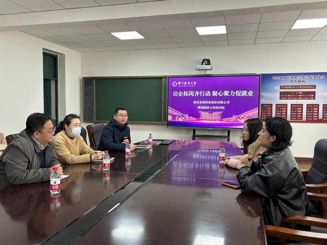 为贯彻落实《威廉希尔书记董事长访企拓岗促就业专项行动实施方案》,积极为员工搭建实习、实践和就业平台,满足企业和社会的需求,3月22日,威廉希尔官网与南京圣和药业股份有限公司开展访企拓岗促就业工作座谈会,南京圣和药业股份有限公司人力资源经理常思雨、学术经理杨文馨、学院经理郭斌、党委书记张悦、科级干部和辅导员参加了座谈,座谈会由员工工作办公室主任张磊主持。
